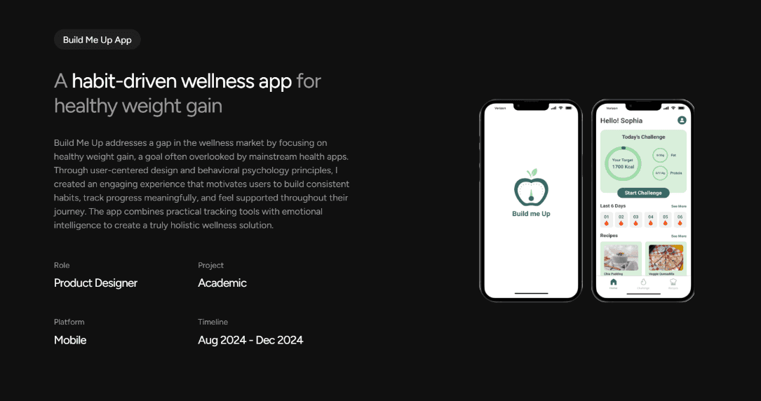 Build Me Up addresses a gap in the wellness market by focusing on healthy weight gain, a goal often overlooked by mainstream health apps. Through user-centered design and behavioral psychology principles, I created an engaging experience that motivates users to build consistent habits, track progress meaningfully, and feel supported throughout their journey. The app combines practical tracking tools with emotional intelligence to create a truly holistic wellness solution.