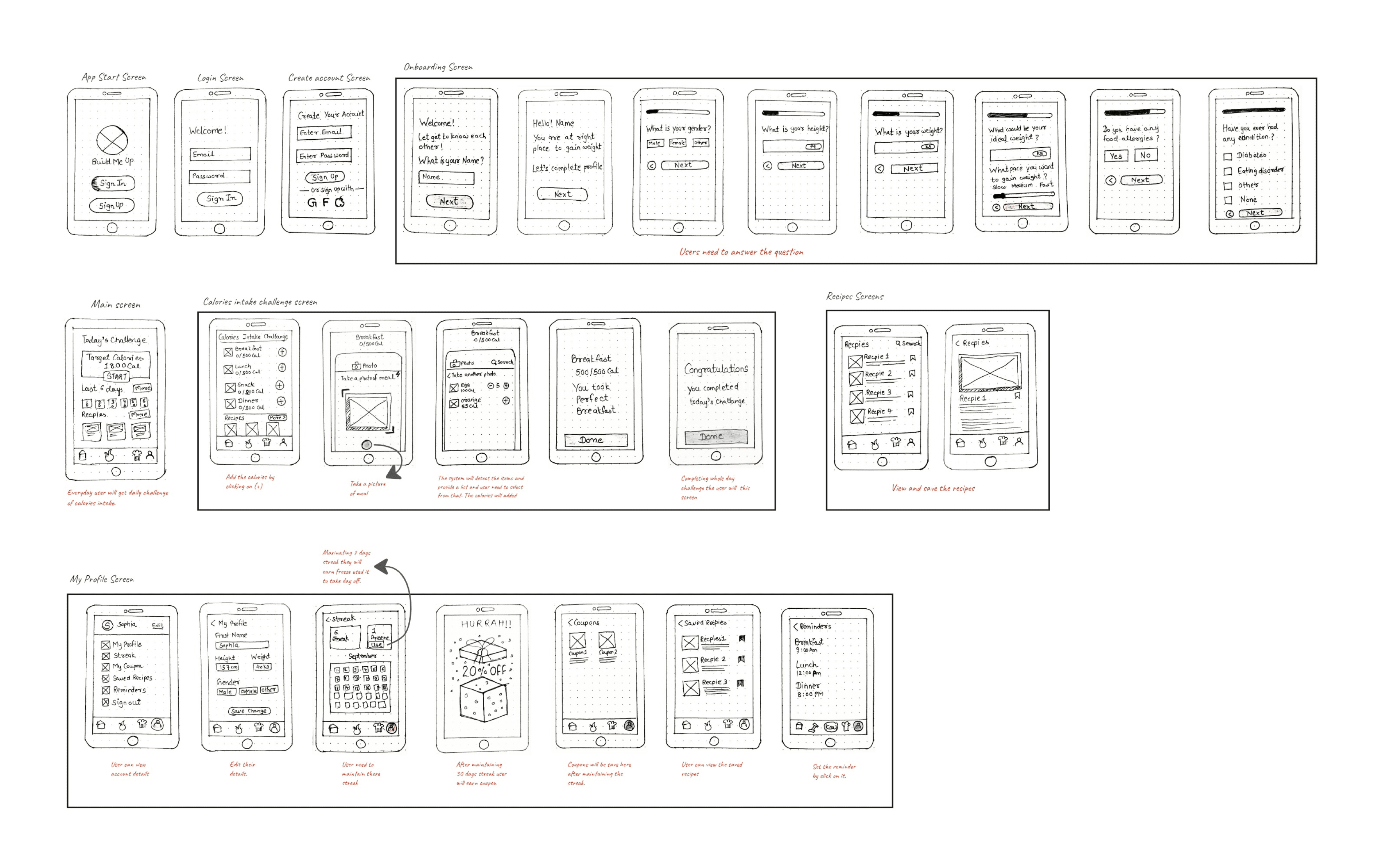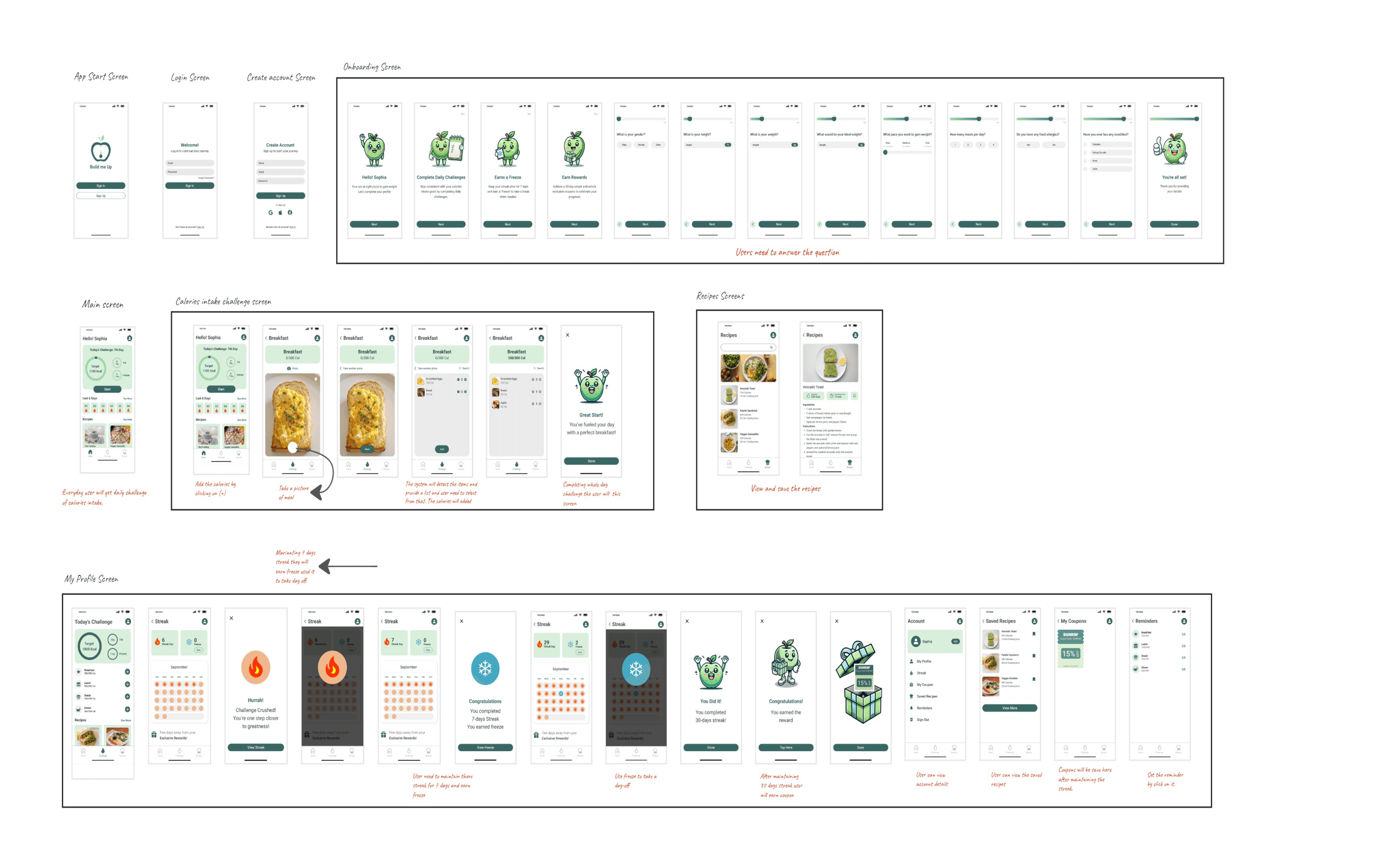 I created a detailed user flow. This helped me organize the app’s core features, ensuring a seamless experience as users move through their weight gain journey. The flow covered everything from account setup to accessing daily challenges, maintain streak and provide recipes tailored to gain weight.