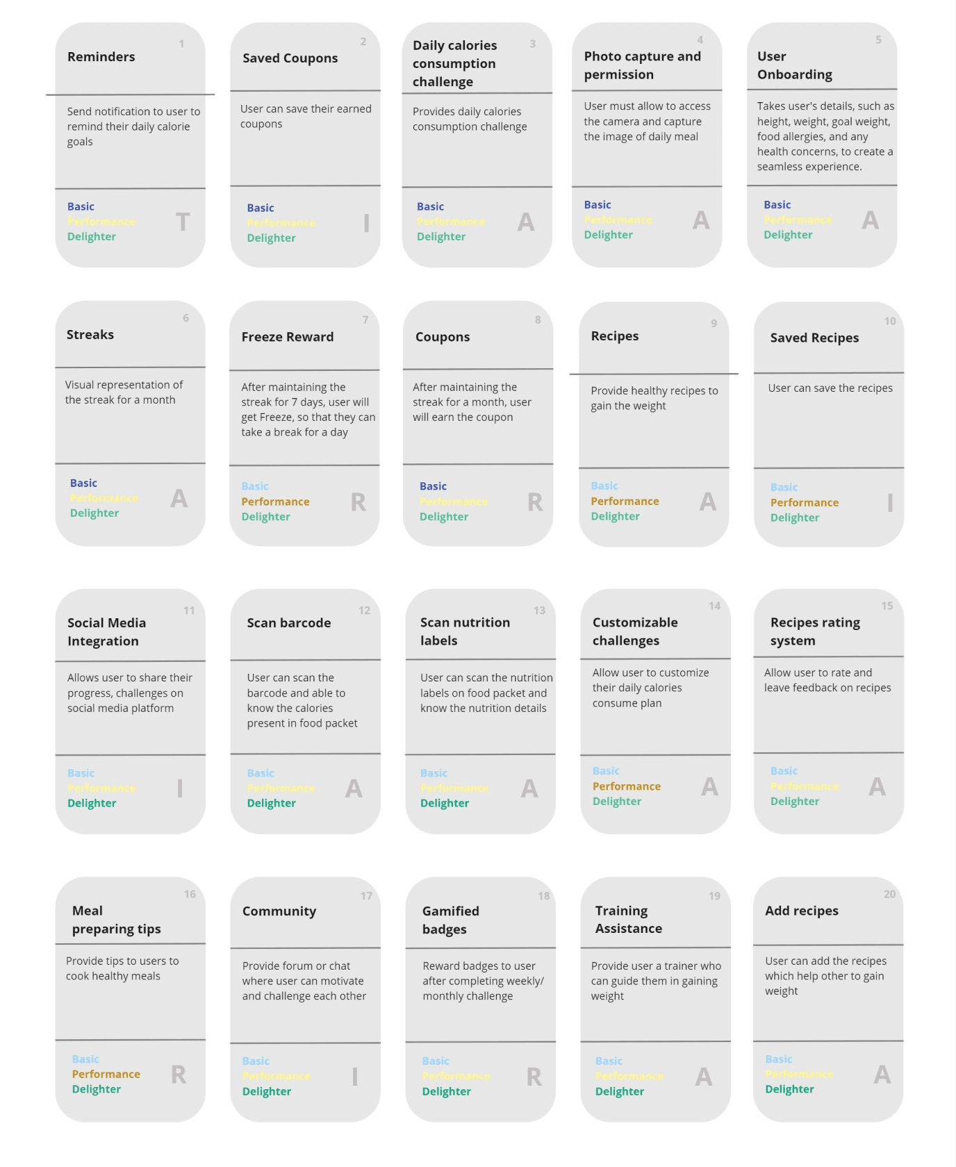 To ensure Build Me Up delivered meaningful value to users, I used the Kano Model to categorize features based on how they impact user satisfaction. I identified core functionalities like calories challenges and goal setting as basic needs, which users expect by default. Features such as streak tracking and personalized recipes suggestions were classified as performance features that directly increase satisfaction. Surprise elements like rewards served as delighters. This approach helped me strike a balance between utility and delight in the product experience.