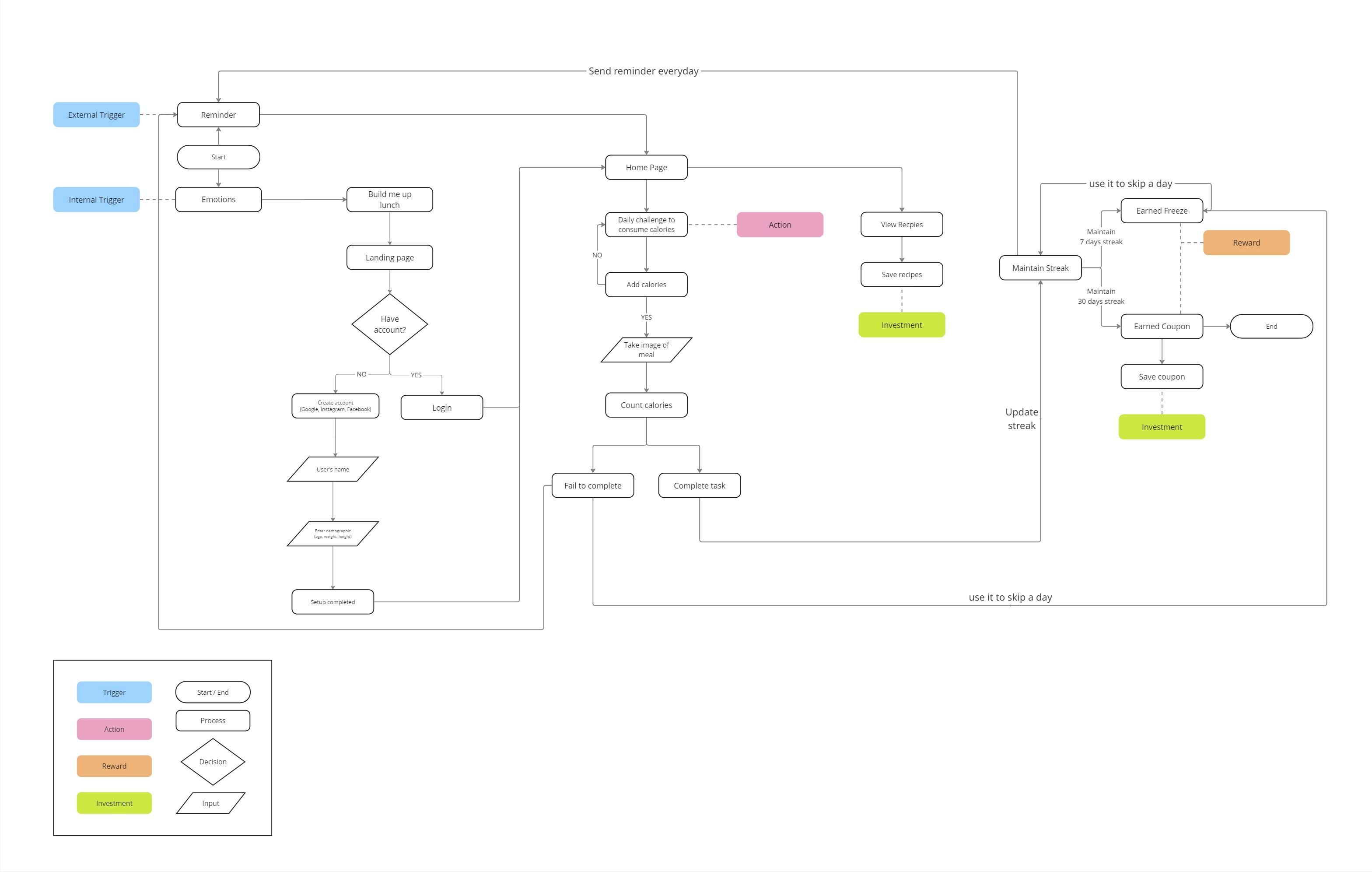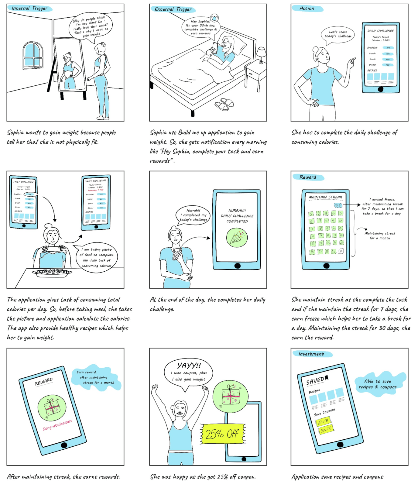 To design a user-friendly and engaging experience for Build Me Up, I visualized the user journey through a storyboard, applying the Trigger–Action–Reward–Investment framework. Notifications serve as the trigger, prompting users to open the app. The daily challenge acts as the action, encouraging users to participate actively. Completing challenges and maintaining a streak provides the reward, reinforcing a sense of progress. As users save recipes and unlock coupons, they invest more into the app, increasing their likelihood of returning and building a lasting habit around healthy weight gain.