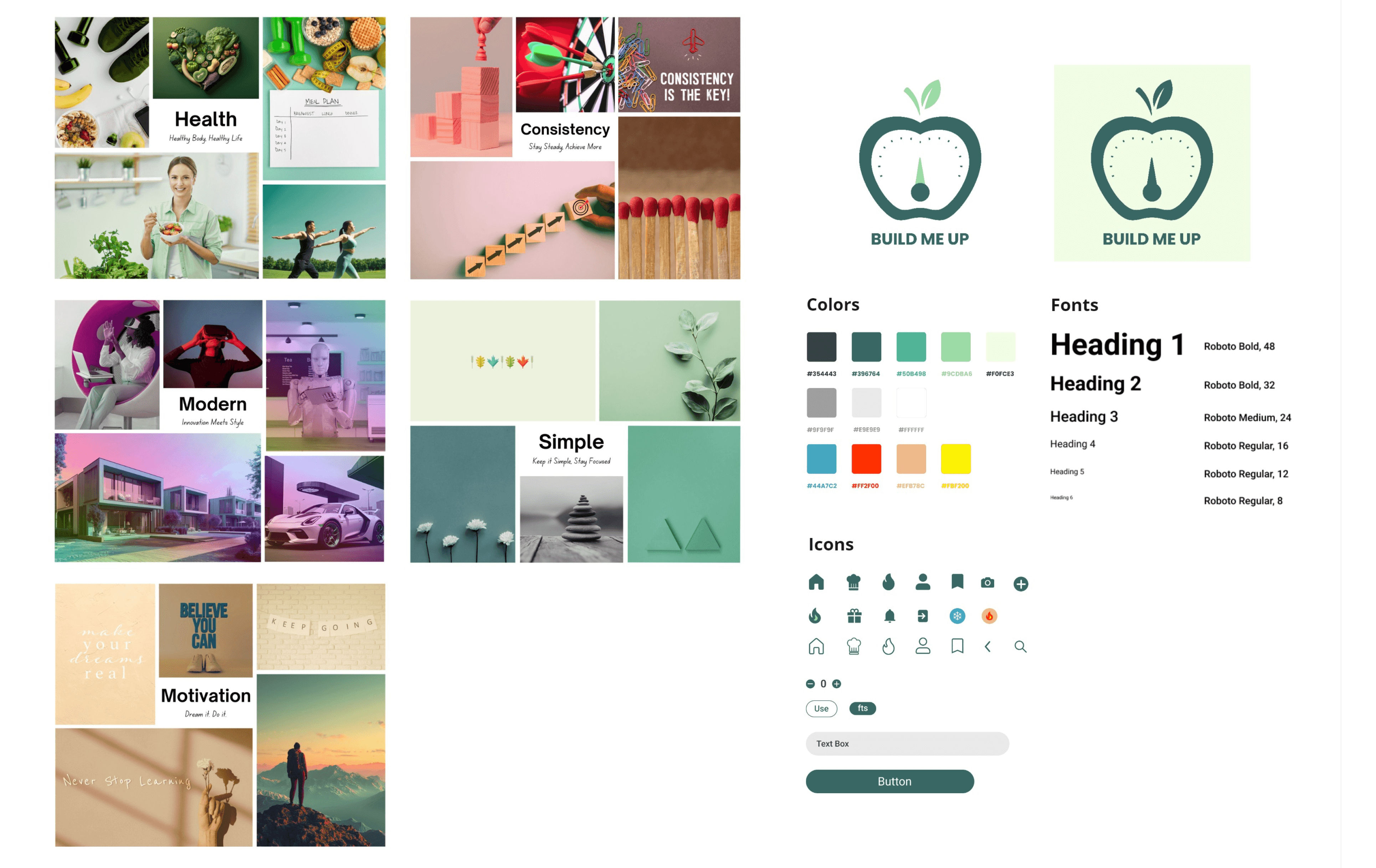 To set the visual tone for Build Me Up, I created a mood board centered around simple, heath, modern, consistency and motivation. The imagery was vibrant, using natural and earthy tones to evoke feelings of health, comfort, and energy. This laid the foundation for a style guide that ensured consistency and clarity across the app. I selected a warm, inviting color palette and paired it with clean, legible typography to support accessibility. Together, these elements created a cohesive, user-friendly aesthetic aligned with the app’s supportive and motivational purpose.