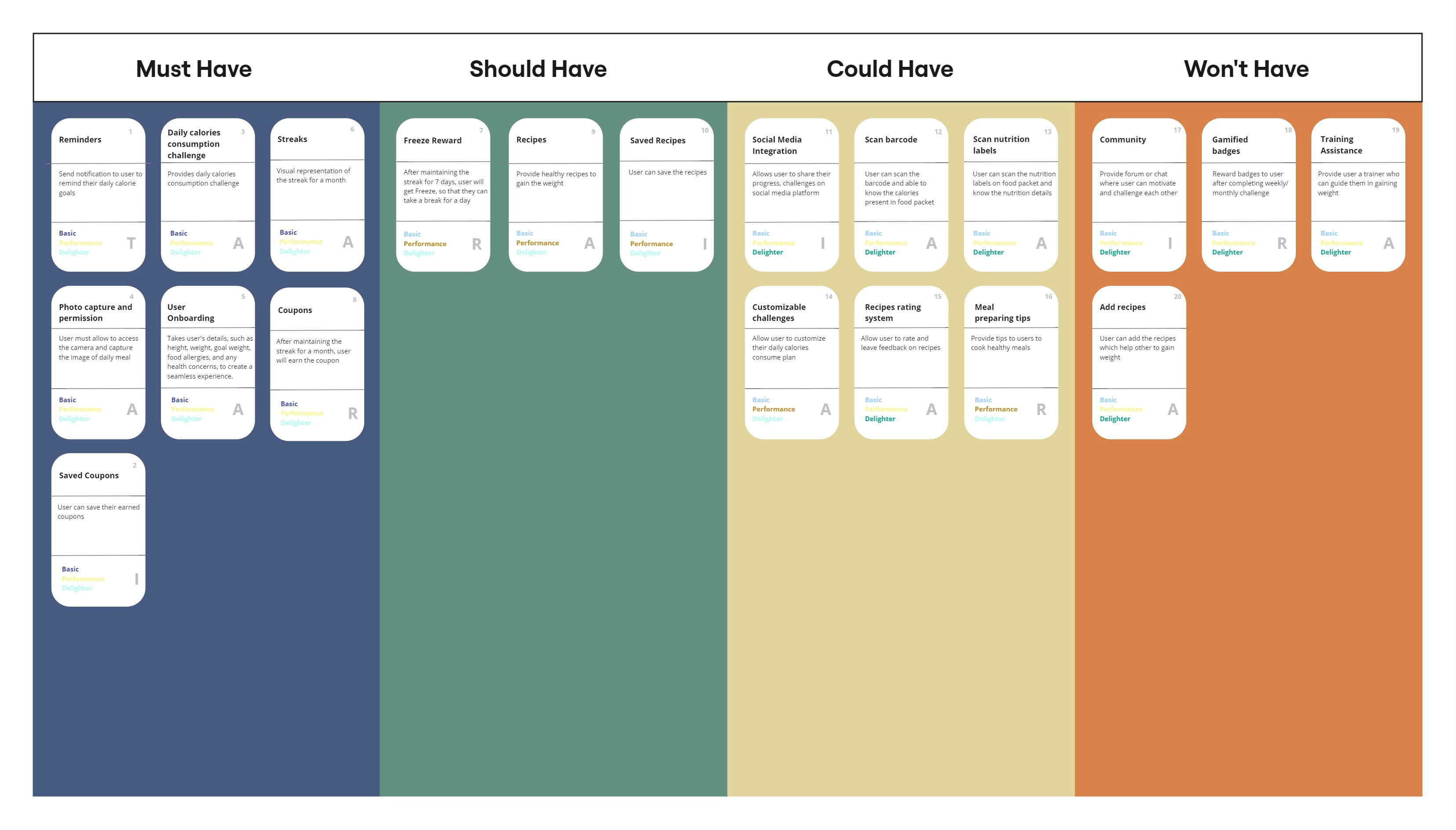 To translate ideas into an actionable roadmap, I applied the MoSCoW method to prioritize features based on necessity and feasibility. I labeled critical elements like sign-up, daily challenges, and notification systems as Must-haves. Should-haves included features like provide recipes, freeze reward. Could-haves were things like social media integrations scan barcode and nutrition label, and Won’t-haves were ideas I intentionally deprioritized for future phases. This clear structure helped me manage scope and stay focused on what mattered most for the MVP.