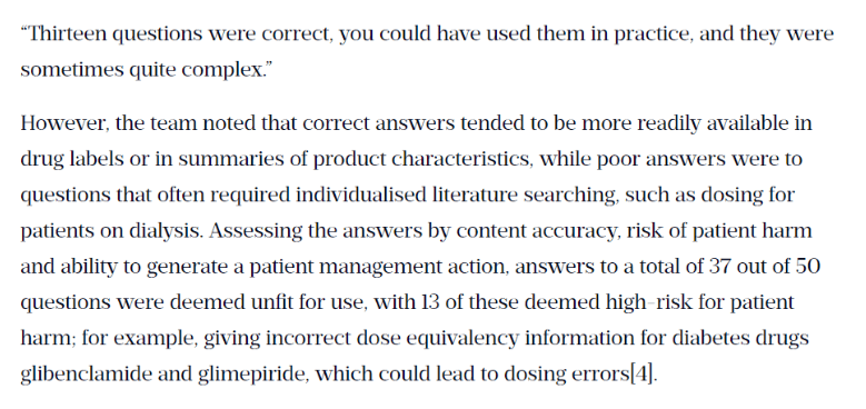 In conclusion, while AI chatbots offer significant benefits such as time-saving and ease of use in pharmacy education research, there is a critical need to improve their reliability in providing accurate responses. Addressing this challenge will maximize the potential of AI chatbots as valuable tools in advancing research and learning in the field.