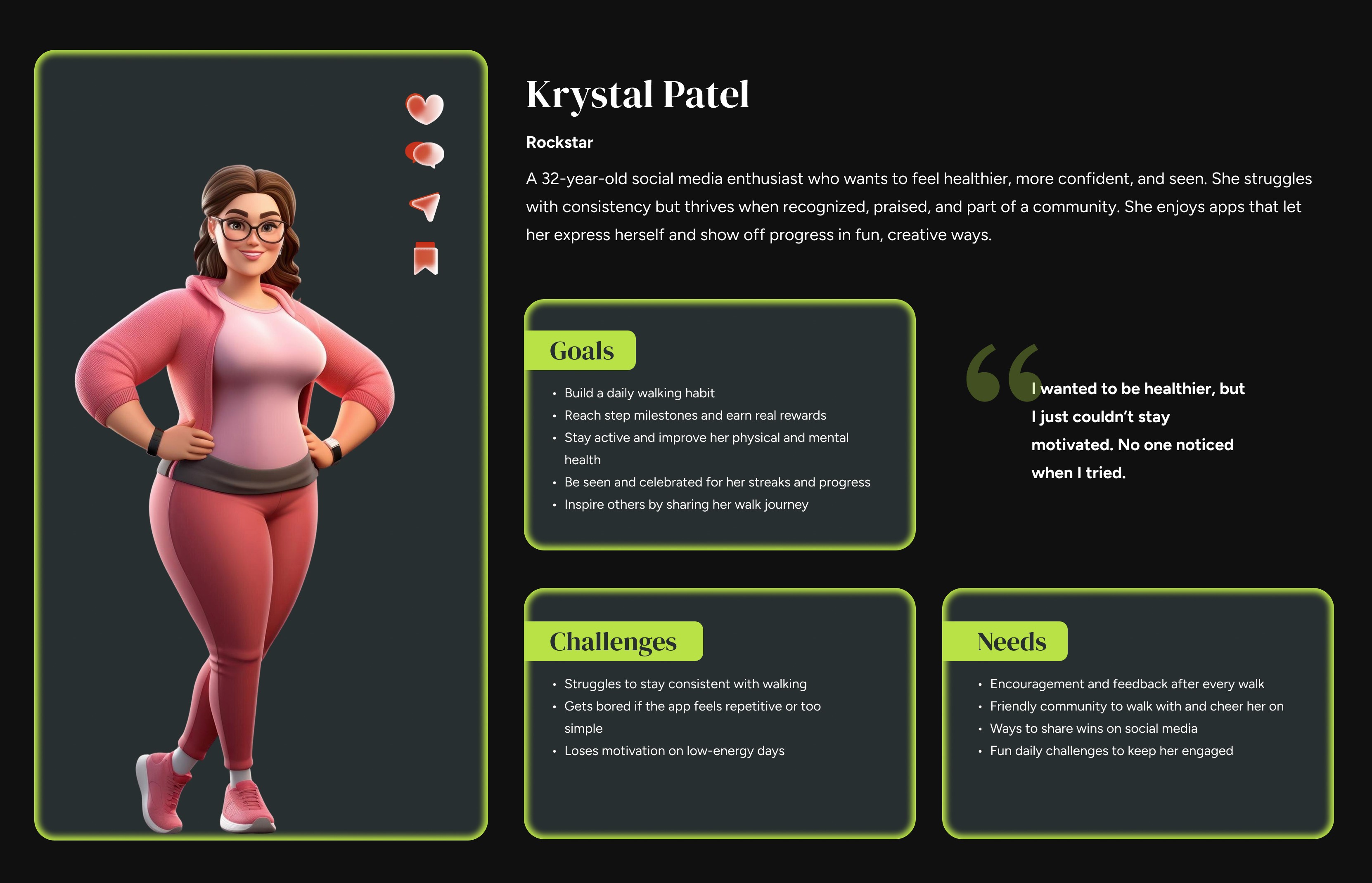 Despite growing awareness of physical health, many adults especially those with sedentary lifestyles struggle to maintain consistent walking habits. Most fitness apps focus on tracking data but lack emotional triggers and accountability systems needed to sustain motivation.