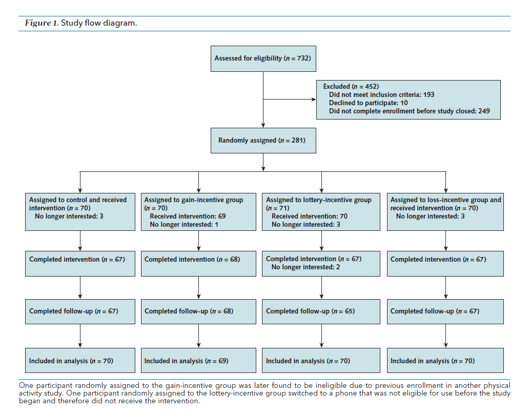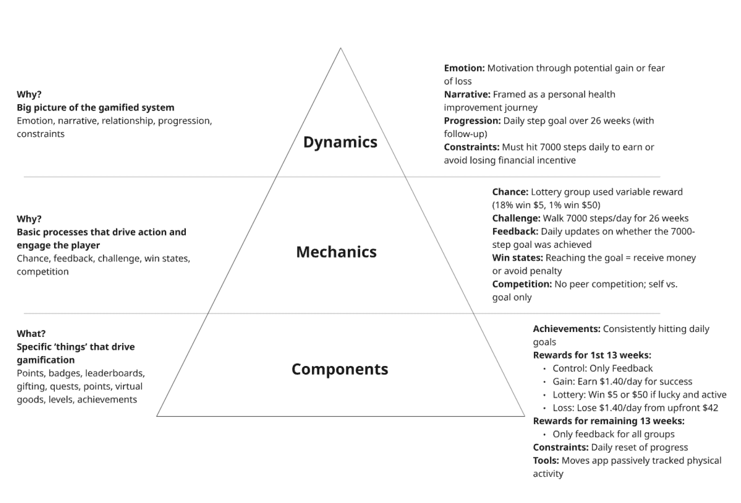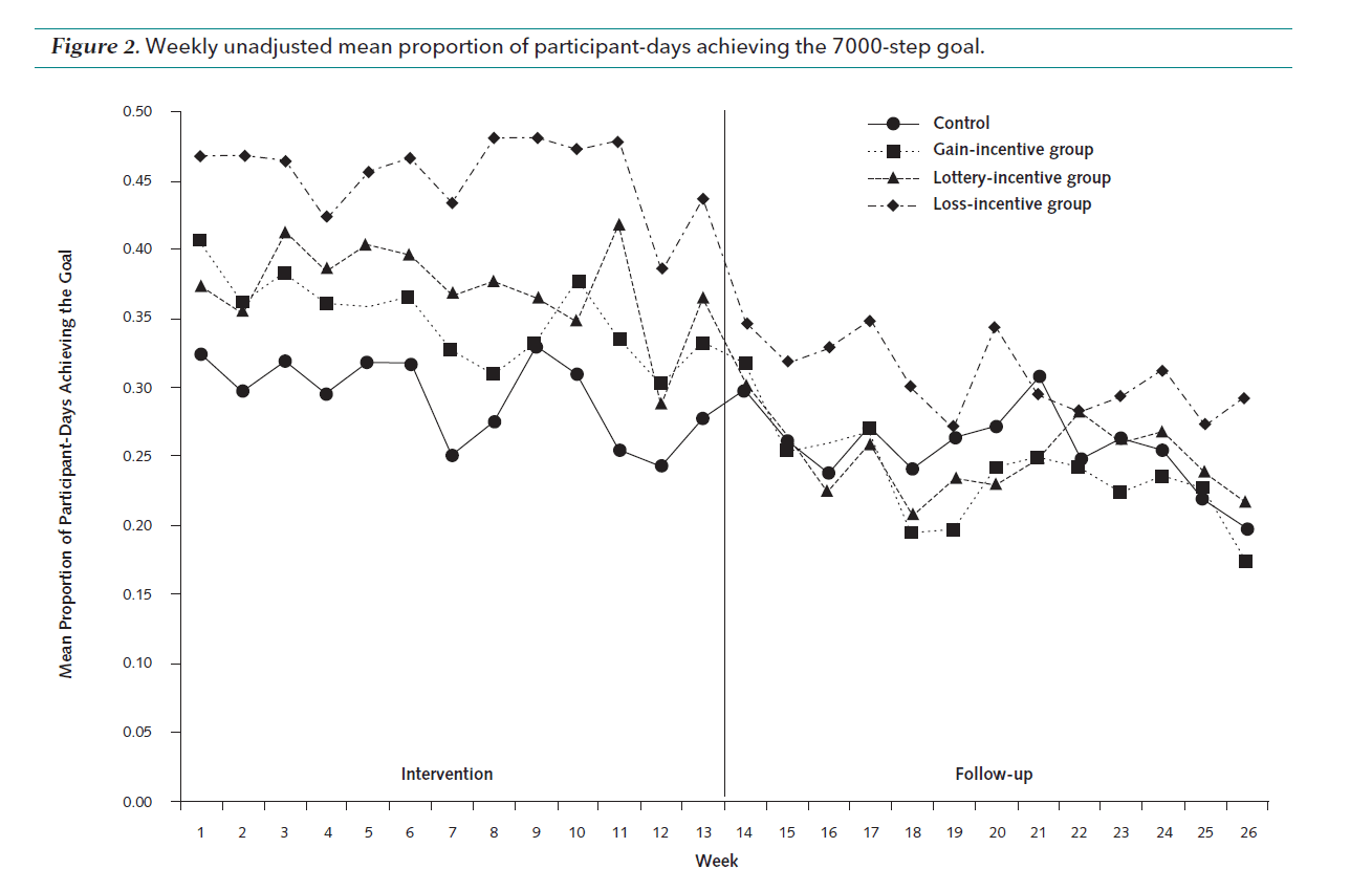 A 26 week randomized controlled trial by the University of Pennsylvania tested different financial incentive models to increase daily step counts. The loss framed model, where participants were given money upfront and lost it if they missed goals, achieved the highest adherence rate at 45 percent. However, once incentives ended, activity levels declined across all groups.