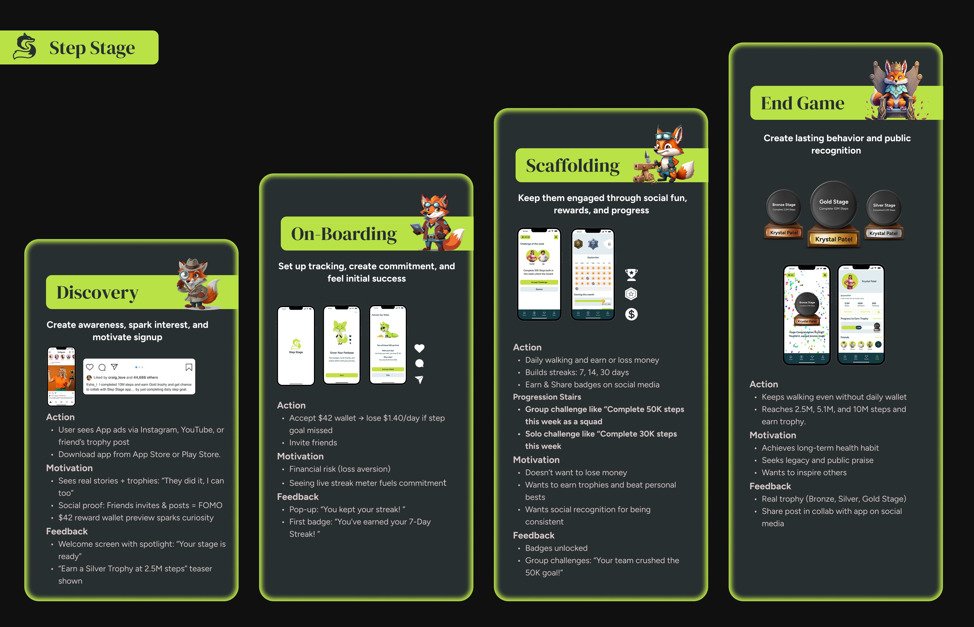 StepStage addresses a gap in fitness apps by focusing on sustained motivation rather than step tracking alone. Based on a University of Pennsylvania research study on loss-framed incentives, I designed an experience that helps users build consistent walking habits through structured progression and motivational reinforcement. The app combines behavioral nudges, emotionally engaging feedback, and clear achievement pathways to transform walking into a meaningful and rewarding experience. By balancing extrinsic triggers with intrinsic motivation, StepStage supports long-term behavior change and sustainable habit formation.